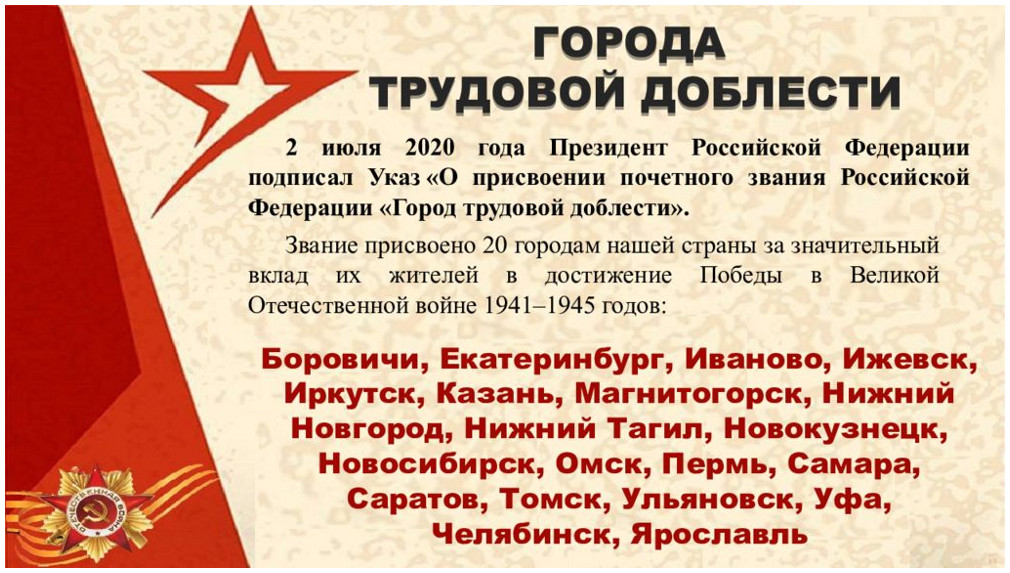 Указом Президента Российской Федерации Томску присвоено звание «Город трудовой доблести» (2020)