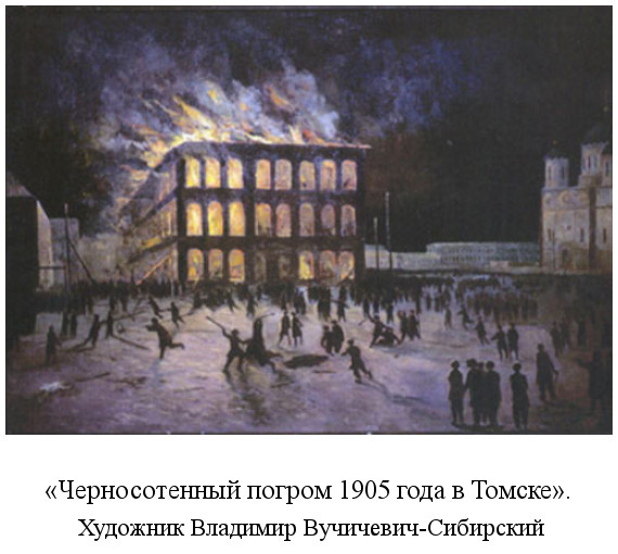 В этот же день сгорел и театр Е. И. Королева. Два громадных здания пылали, море огня заливало большую площадь. По словам очевидца, в эти дни в Томске «для того, чтобы быть убитым, достаточно было обладать приличным костюмом и интеллигентной физиономией. Студенческая фуражка или лишь похожая на нее папаха и еврейский тип лица были вернейшими смертными приговорами». Жуткую картину пожара запечатлел на своем полотне «Черносотенный погром 1905 года в Томске» художник В. Д. Вучичевич-Сибирский (1869–1919).