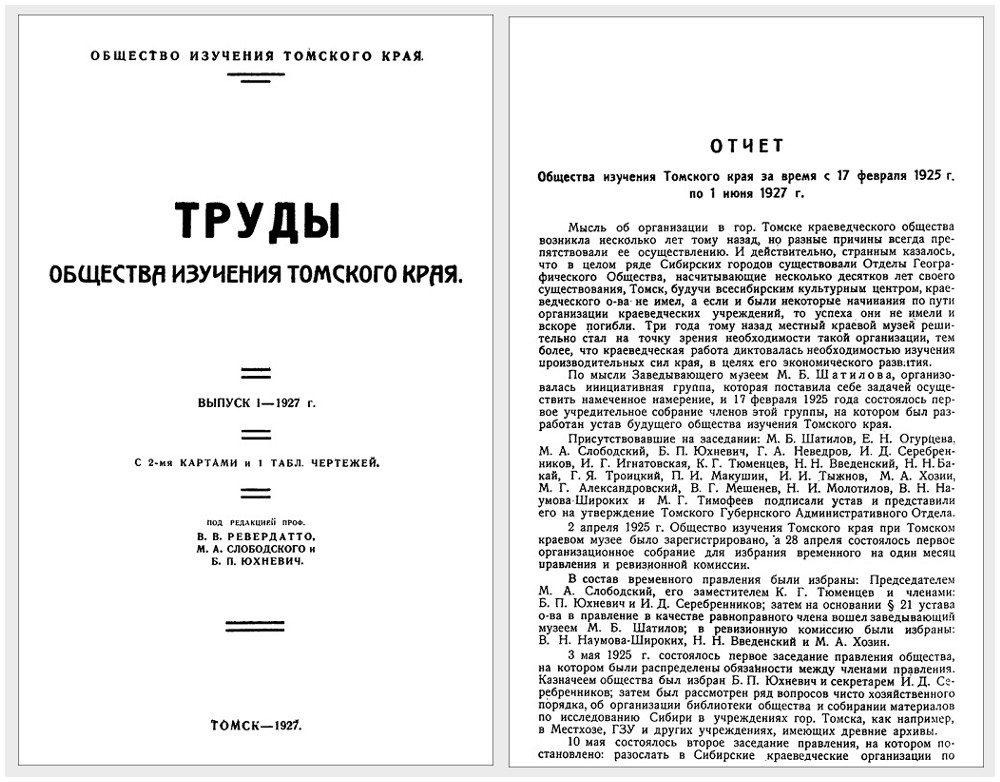 - Труды Общества изучения Томского края / О-во изучения Том. края ; под ред. В. В. Ревердатто, М. А. Слободского и Б. П. Юхневич. – Томск : [б. и.], (Типография издательства "Красное знамя"). – 1927. – Вып. 1. – [2], 104 с., [4] л. ил., схемы. – Издание из фонда им. А. С. Пушкина.