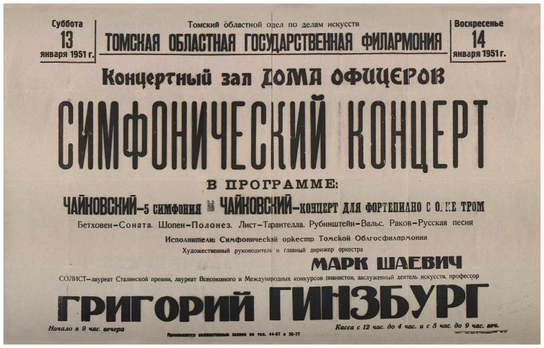 75 лет назад , 13 января 1951-го, в Концертном зале Дома офицеров симфонический оркестр Томской филармонии под руководством дирижера М. Б. Шаевича исполнил 5-ю симфонию и Концерт для фортепиано с оркестром П. И. Чайковского, произведения Бетховена, Шопена, Листа, Рубинштейна, Ракова. Солист – Григорий Гинзбург (1904–1961), пианист-виртуоз, профессор, лауреат Сталинской премии, лауреат Международных конкурсов.