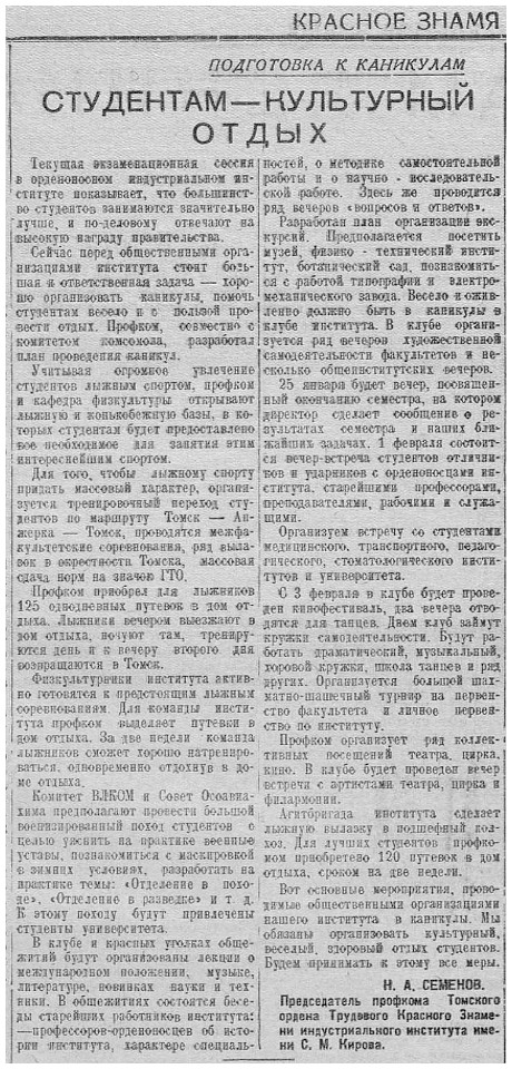 85 лет назад , 24 января 1941 года, в Томске начались очередные зимние студенческие каникулы. Комитет ВЛКСМ университета совместно с Осовиахимом организовал военизированный поход студентов, чтобы отработать на практике военные уставы, маскировку в зимних условиях и т. д. В педагогическом институте началась подготовка к стрелковому соревнованию факультетов. Студенты стоматологического института устроили большой вечер-концерт, посвященный А. С. Пушкину. В клубе студентов индустриального института шел фильм «Яков Свердлов».