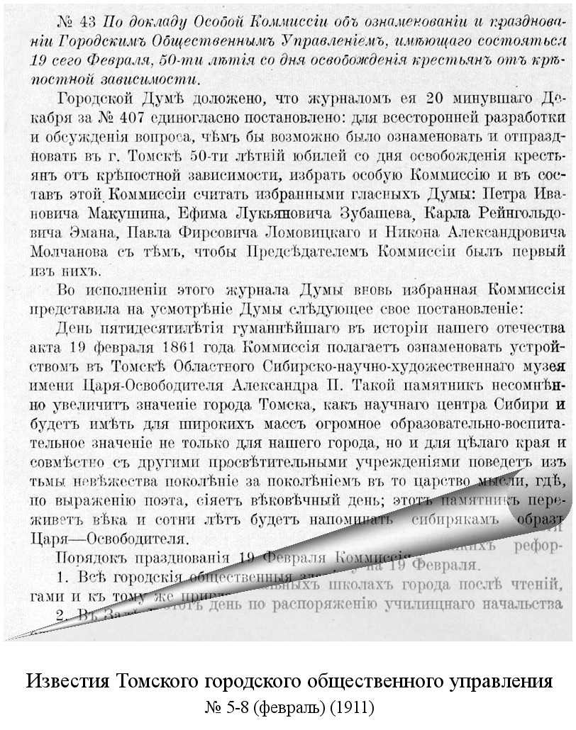 - [Постановление] № 43 [от 3 февраля 1911 г.]. По докладу особой комиссии об ознаменовании и праздновании Городским общественным управлением, имеющего состояться 19 сего февраля 50-летия со дня освобождения крестьян от крепостной зависимости. – Текст : электронный // Известия Томского городского общественного управления. – 1911. – № 5–8 (февр.). – С. 114–122. – Дата: с. 113. – URL: https://www.elib.tomsk.ru/purl/1-10118/.