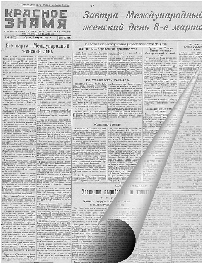 75 лет назад , 8 марта 1951 года, в передовой статье томской газеты «Красное знамя», посвященной 8 Марта, названы имена передовых женщин области – «труженицы колхозных полей» А. Д. Смирновой, табаковода А. А. Фофиной, «женщин-ученых» А. Г. Сватиковой, М. А. Большаниной, Л. П. Сергиевской, учительниц З. П. Пчеловой и А. Г. Толстых.