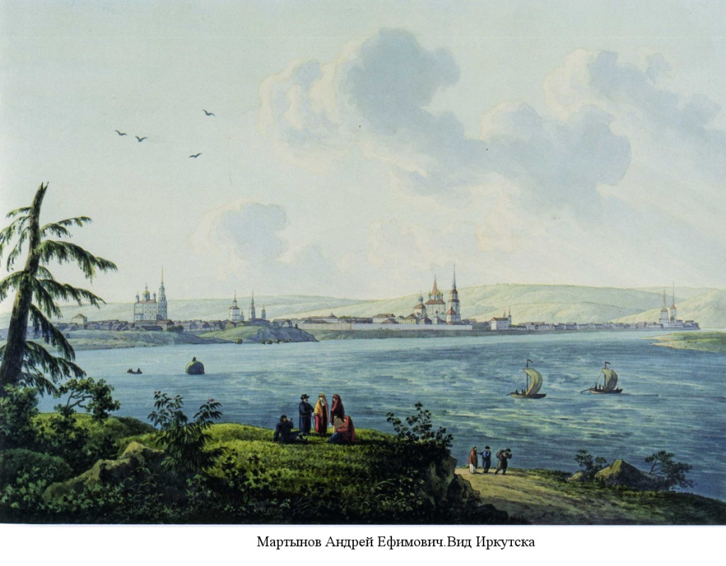 Один из листов посвящен нашему городу. Изображая Томск, художник обратился к панорамному виду. Первый план представляет собой пейзаж – изображение невысокого холма, кустарник, невысокие деревья, растущие в низине, пасущихся коров, мужчину и женщину в ярком алом покрывале. Это красочное пятно живописно обогащает графический лист, позволяет почувствовать тонкие градации зеленого цвета, служащего основой живописной гаммы произведения. Художник подчеркивает особенности ландшафта города, который делится рекой Ушайкой на две части. Высокие берега густо населены, стройные силуэты церквей и колоколен придают панораме законченный вид.