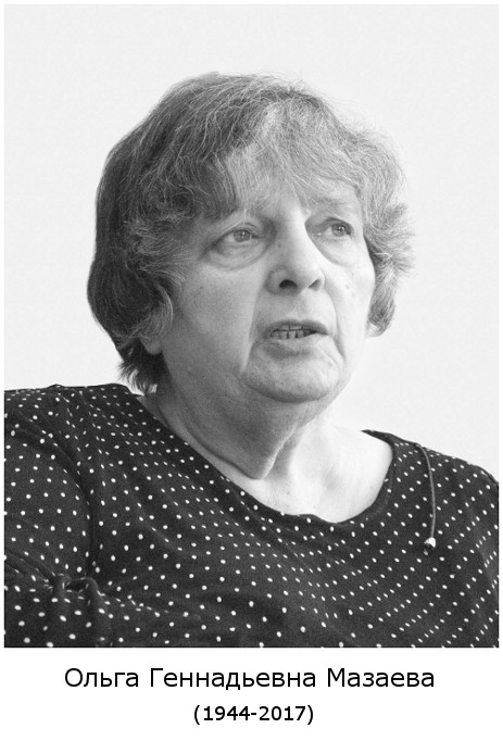 - О. Г. Мазаева. In memoriam : [сб.] / Нац. исслед. Том. гос. ун-т ; под ред. Е. В. Борисова [и др.]. – Томск : Изд. Дом Том. гос. ун-та, 2018. – 150 с., [8] л. ил., портр. – Библиогр.: с. 147–150 и в подстроч. примеч. – Текст : непосредственный. – Издание из фонда ТОУНБ им. А. С. Пушкина.