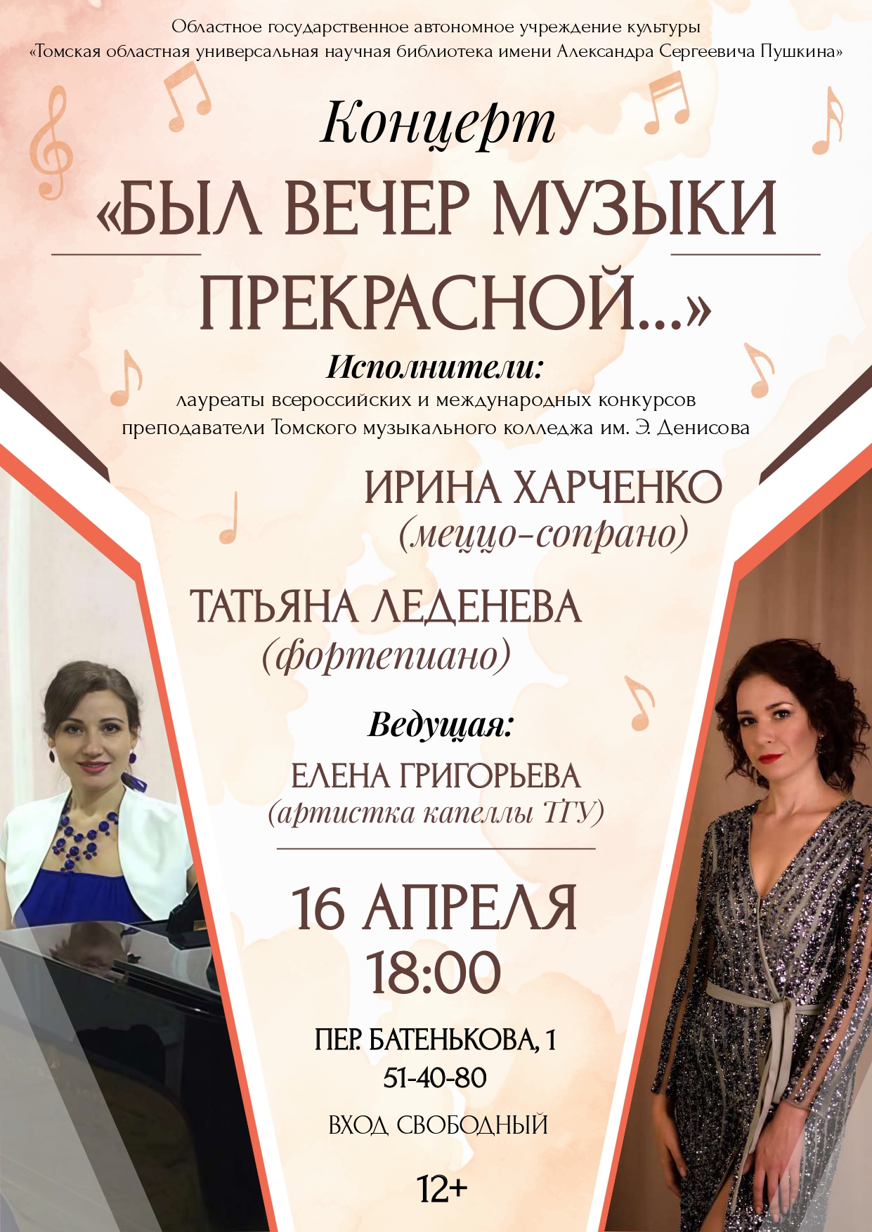 Приглашаем ценителей вокальной и фортепианной музыки на концерт с поэтическим названием «Был вечер музыки прекрасной…», на котором выступят лауреаты всесоюзных и международных конкурсов, преподаватели Томского музыкального колледжа им. Э. Денисова Ирина Харченко (меццо-сопрано) и Татьяна Леденева (фортепиано).