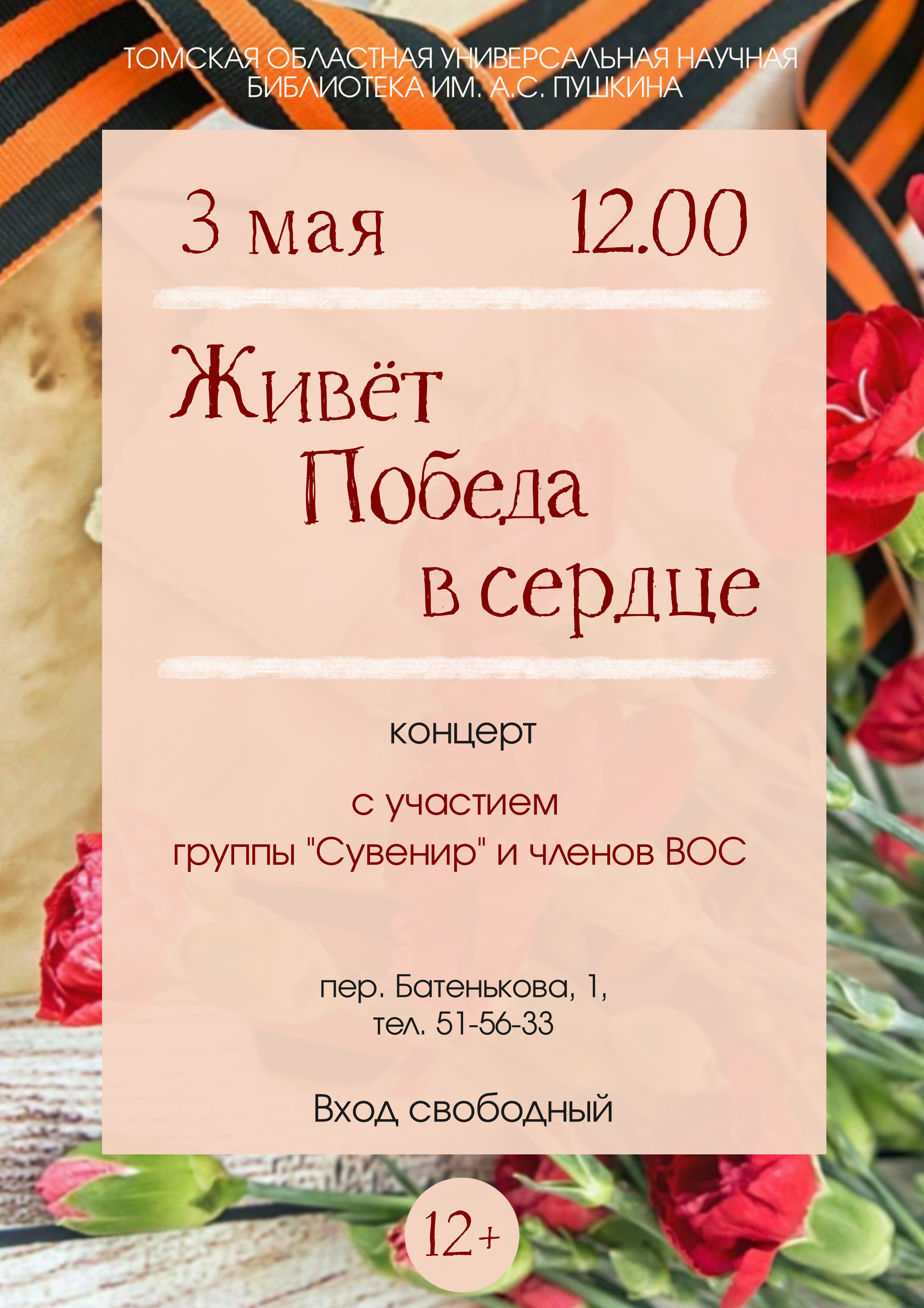 В программе примут участие группа «Сувенир» и члены Томской организации ВОС. Прозвучат песни и стихи о войне и Победе, а также будут продемонстрированы театральные зарисовки на основе литературных произведений.