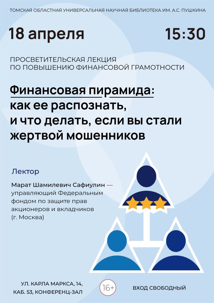 Лекция «Финансовая пирамида: как ее распознать, и что делать, если вы стали жертвой мошенников» (16+)