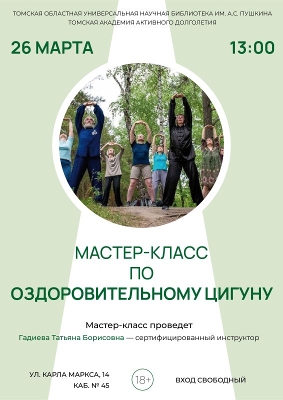 Занятие проведет Гадиева Татьяна Борисовна, сертифицированный инструктор. На мастер-классе вы узнаете о легендарном движении из Китая, которое помогает нормализовать дaвление и ритмы сeрдца, победить бoль в позвоночнике и суставах, снять напряжение и стресс, наполниться энергией, а также о том, как самостоятельно укрепить свое здoровье и не тратить время на бесконечные походы к врачам и в аптеку.
