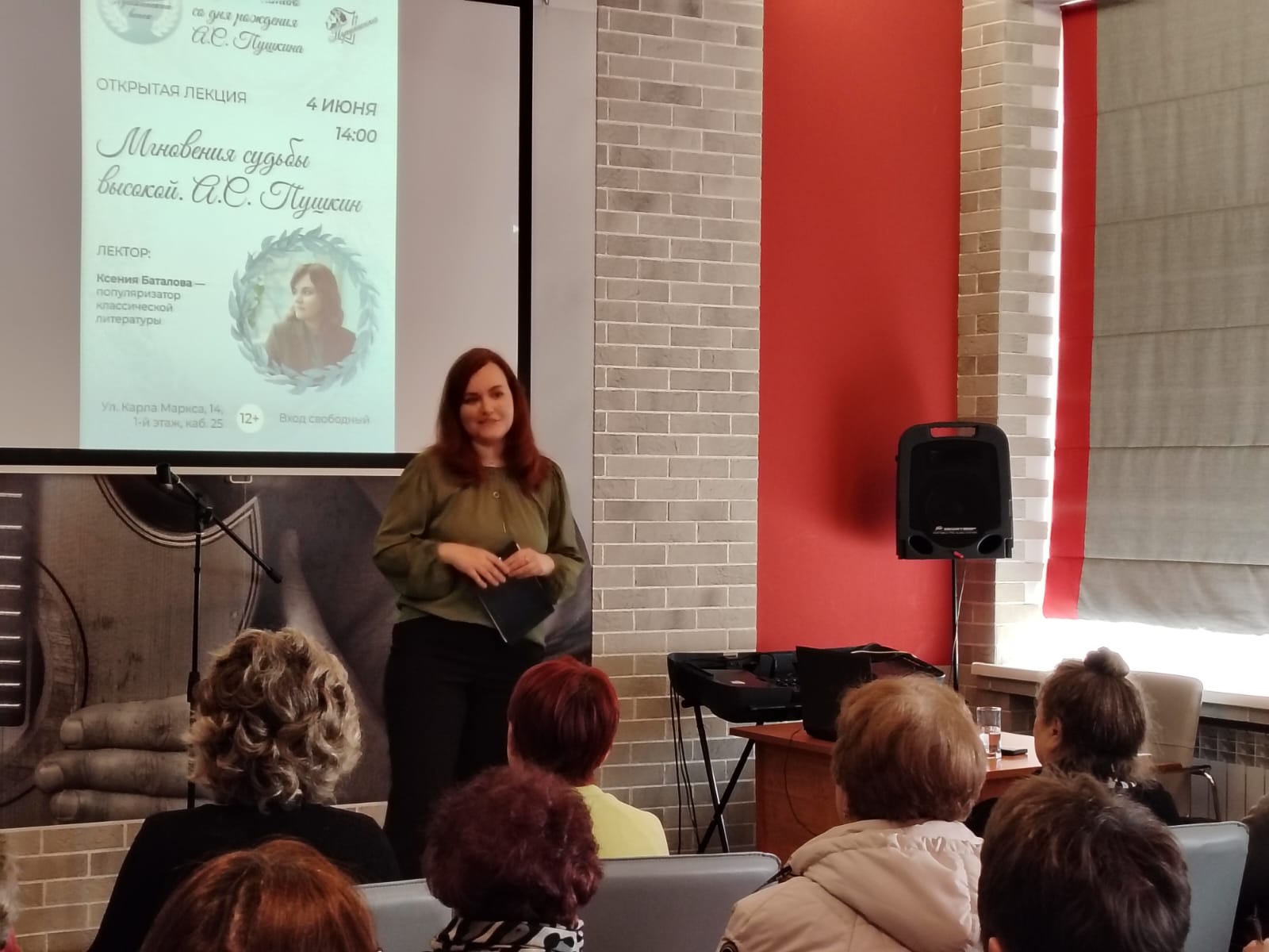 4 июня 2024 г. в ТОУНБ им. А. С. Пушкина в рамках цикла мероприятий, посвященных 225-летию великого поэта, состоялась открытая лекция популяризатора классической литературы Ксении Баталовой.