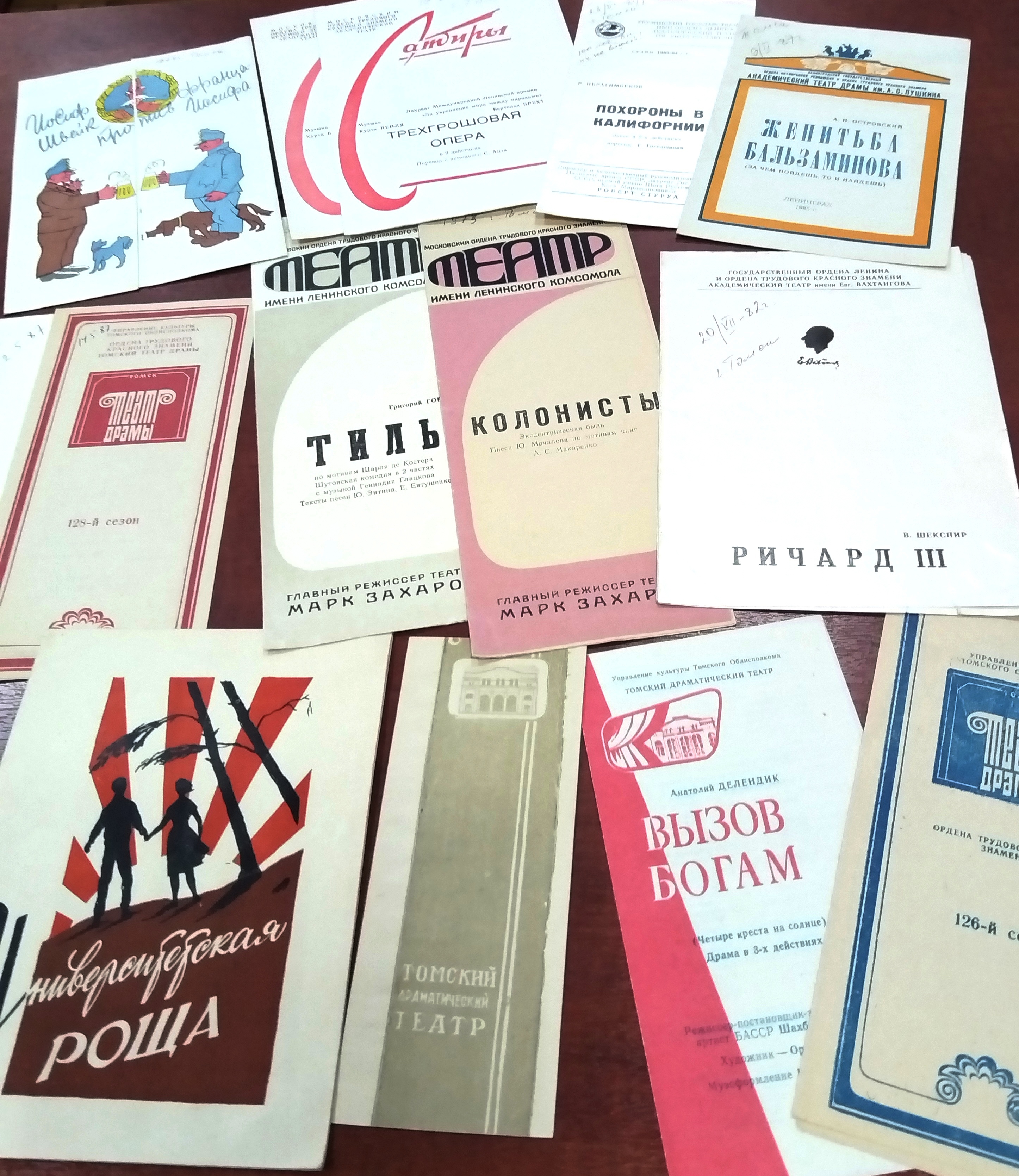 Большим любителем театра была наша Людмила Михайловна Юрьева (1938 — 2023). Ее архив полон программок театров, приезжавших в Томск на гастроли — Театра Сатиры (1986), Театра имени Е. Вахтангова (1982), Театра имени Ленинского комсомола (1975). Из этих программок узнаем, что в Томске побывали Николай Караченцов, Инна Чурикова, Михаил Ульянов, Марианна Вертинская, Юрий Яковлев, Андрей Миронов. В программках Томской драмы — Валентина Бекетова, Александр Ланговой, Дмитрий Киржеманов, Галина Непорожнева, Алевтина Буханченко, Тамара Лебедева, Евгений Платохин, Ольга Мальцева, Наталья Юргенс, Георгий Лесников...