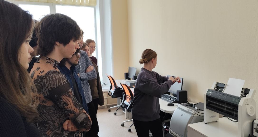 Привлекла внимание экскурсантов техническая база отдела — приборы для письма по Брайлю, брайлевская печатная машинка, а также современное оборудование для автоматизированной печати. Студенты стали свидетелями создания рельефных рисунков с помощью специализированного термопринтера.