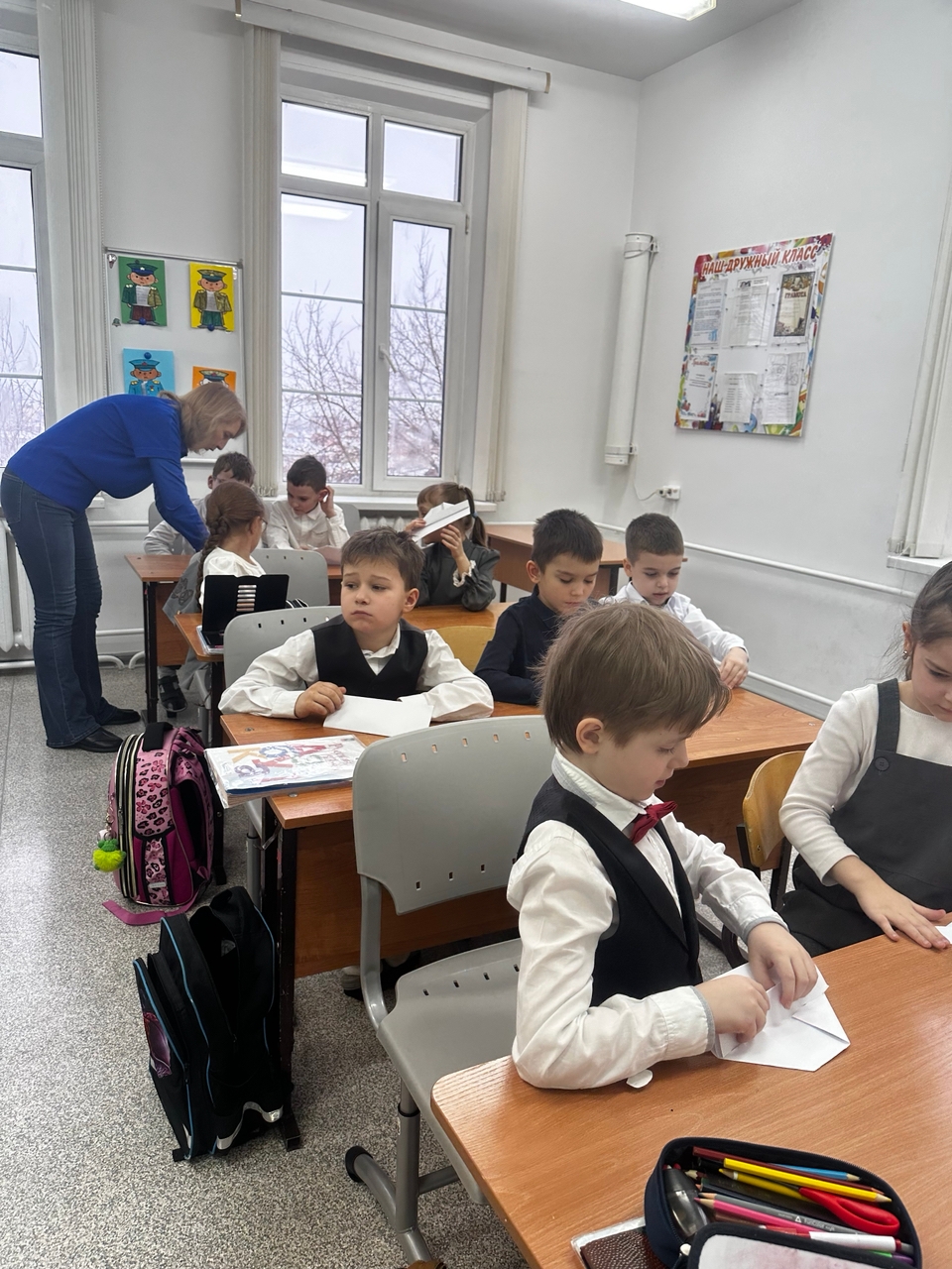 Ребята проявили живой интерес к военной истории нашей страны и показали эрудицию, активно участвуя в викторине, отгадывая загадки о разных военных профессиях, составляя цитаты А. В. Суворова. Вспомнив названия разных военных головных уборов, ребята быстро справились с непростой задачей — научились делать пилотку из бумаги.