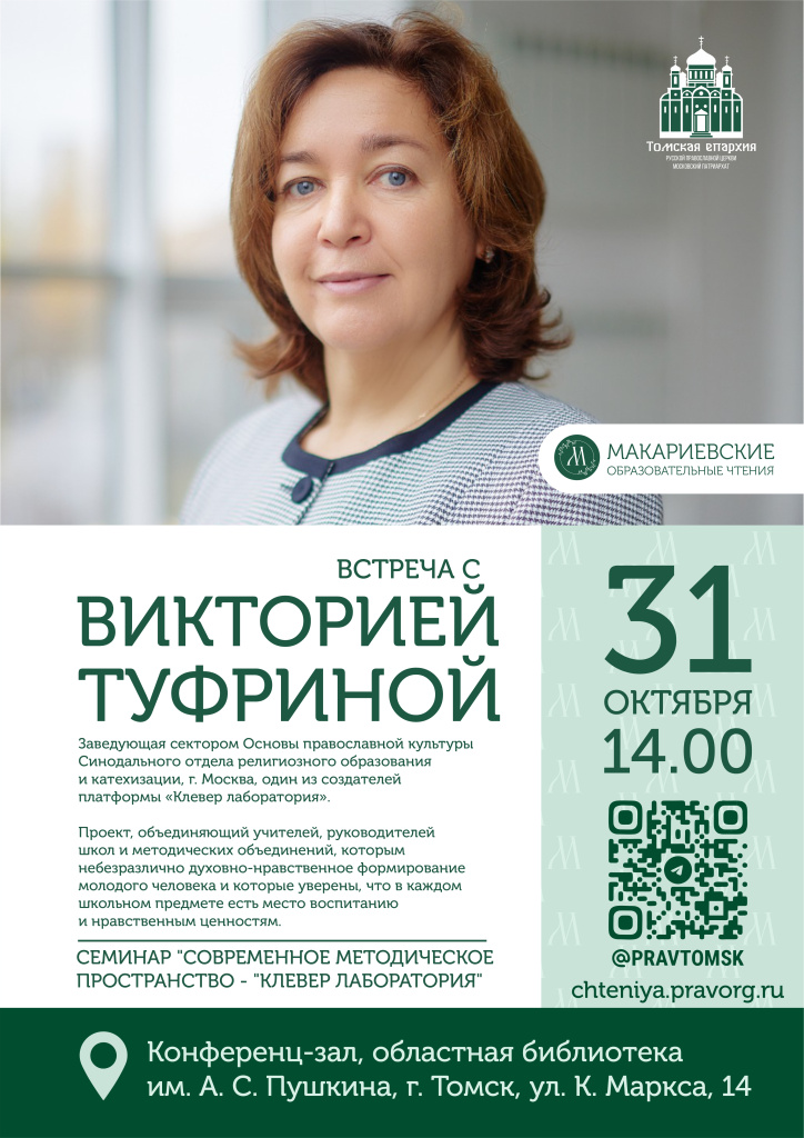 Виктория Юрьевна Туфрина (г. Москва, заведующая сектором Основ Православной культуры СОРОиК РПЦ) проведет семинар «Современное методическое пространство Клевер-лаборатория».