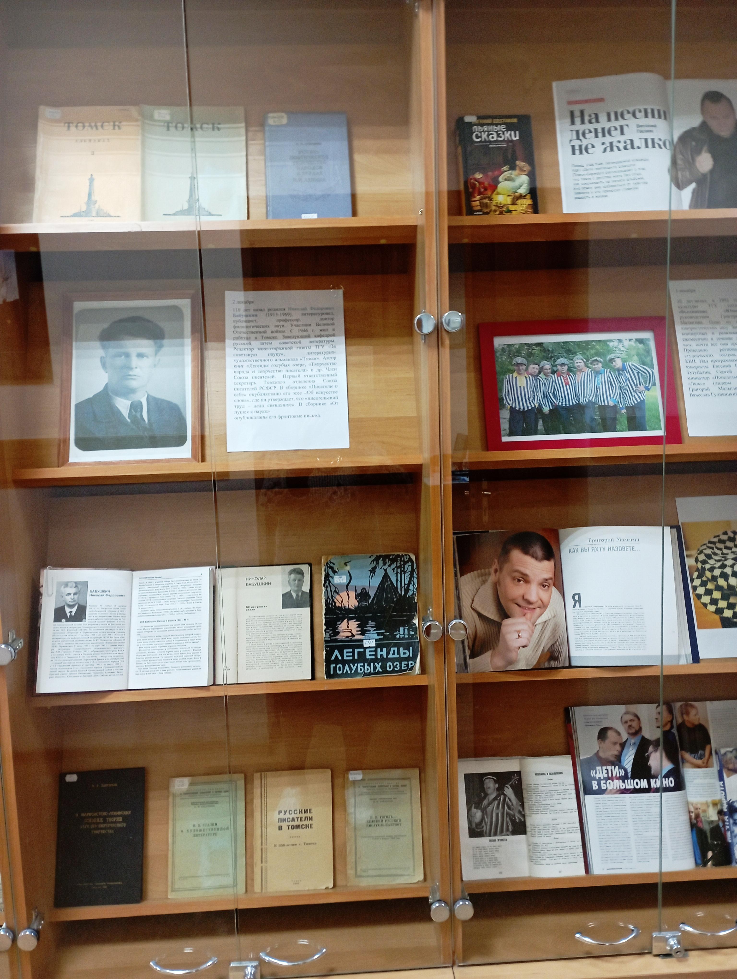 110 лет со дня рождения исполнилось Николаю Федоровичу Бабушкину (1913 — 1969), первому ответственному секретарю Томского отделения Союза писателей РСФСР, филологу, профессору Томского университета. С 1946 г. жил и работал в Томске. Руководил кафедрой русской, затем советской литературы, редактировал газету ТГУ «За советскую науку», литературно-художественный альманах «Томск». Кроме литературоведческих работ на выставке представлен сборник «От пушек к науке», в котором опубликованы его фронтовые письма.