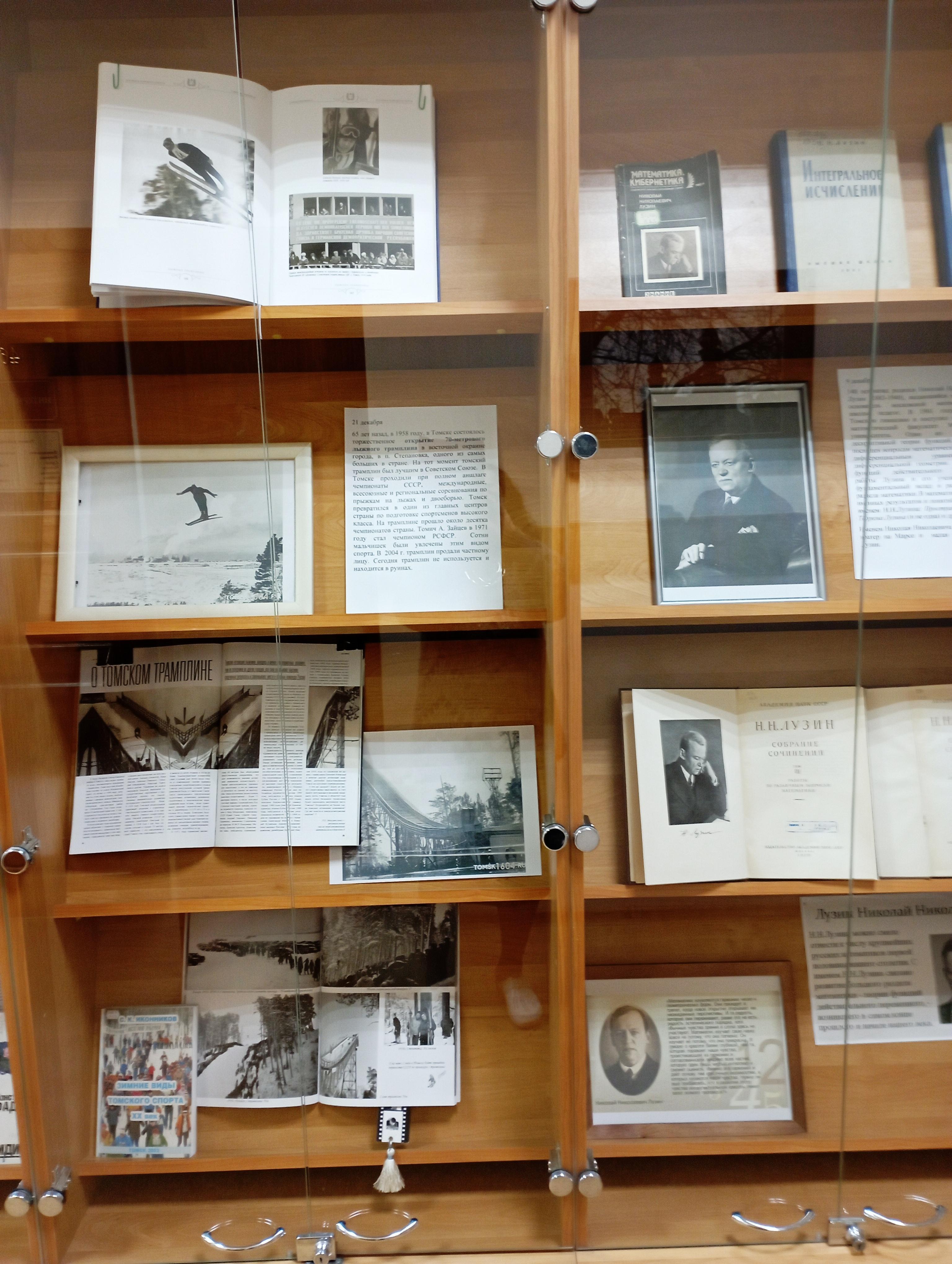 Томск может гордиться тем, что в 1901 г. его мужскую гимназию окончил будущий великий математик Николай Николаевич Лузин (1883 — 1950). 9 декабря исполнилось 140 лет со дня его рождения. Основатель московской математической школы, один из создателей дескриптивной теории функций. Ряд работ посвящен вопросам математического анализа, дифференциальным уравнениям и дифференциальной геометрии. Работы Лузина и его учеников внесли фундаментальный вклад в развитие теории функций действительного переменного. В математике есть много именных результатов и понятий, связанных с именем Н. Н. Лузина: Пространство Лузина, Теорема Лузина (и не одна) и др. Именем Николая Николаевича Лузина названы кратер на Марсе и малая планета (5096) Лузин. На выставке — тома из его собрания сочинений, учебники для вузов, фотографии.