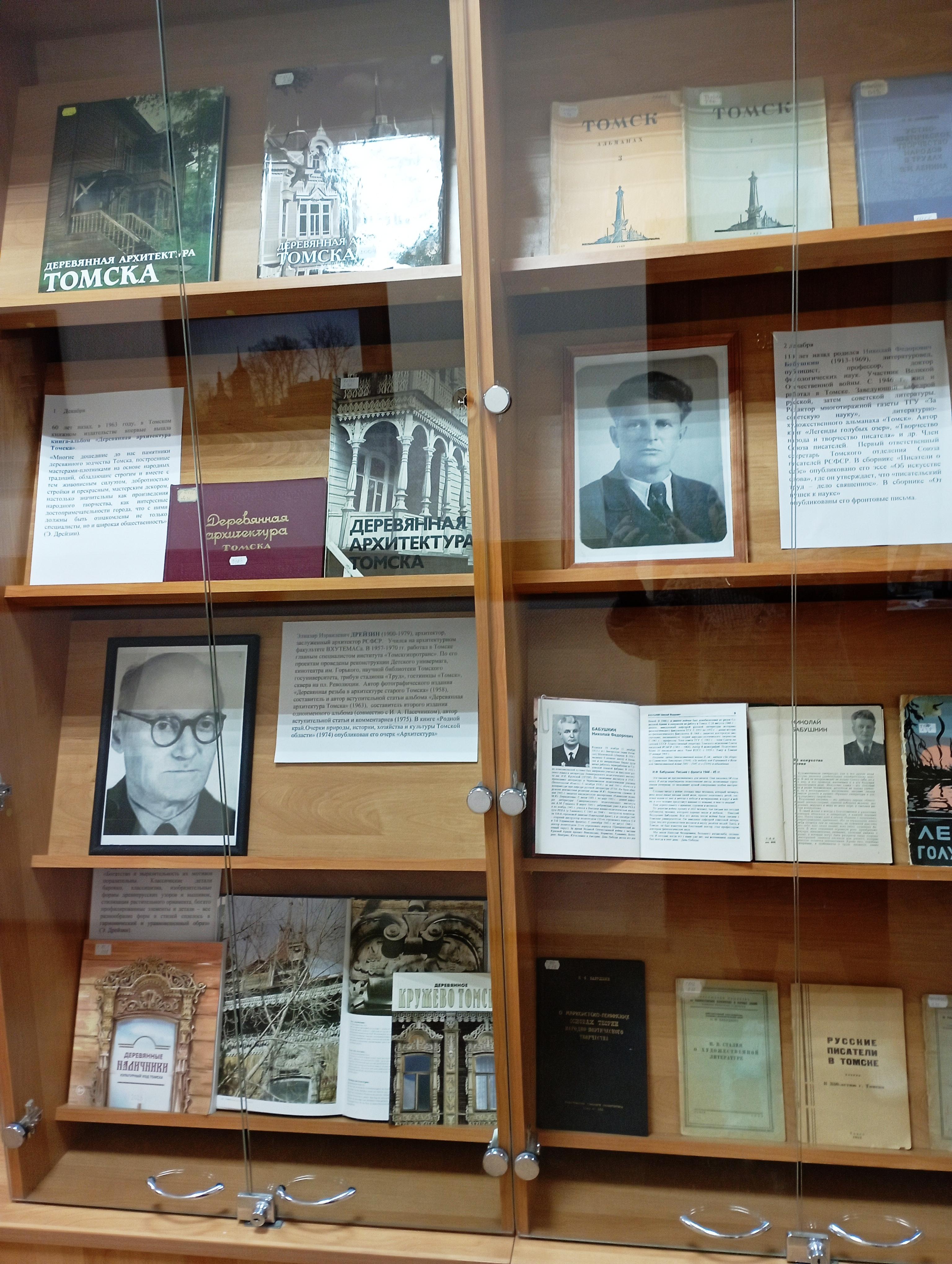 Выставку открывает стенд, рассказывающий об истории издания альбомов, посвященных деревянной архитектуре Томска. 60 лет назад в Томском книжном издательстве вышел первый из них, составил его и написал обширную вступительную статью архитектор Элиазар Дрейзин (1900 — 1979), выпускник ВХУТЕМАСа. В конце 1950-х гг. начал работать в Томске, высоко оценил красоту памятников деревянного зодчества города и счел необходимым ознакомить с ними и специалистов, и широкую общественность. Вот, например, как он пишет о деревянных наличниках: «Богатство и выразительность их мотивов поразительны. Классические детали барокко, классицизма, изобразительные формы древнерусских узоров и вышивок, стилизация растительного орнамента, богато профилированные элементы и детали — все разнообразие форм и стилей сплелось в гармонический и уравновешенный образ». Первое издание «Деревянной архитектуры» окружают последовавшие за ним прекрасные издания 1975, 1987, 2004, 2010 гг.