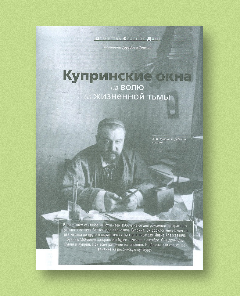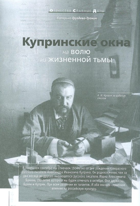 В статье рассматривается многогранное творчество Александра Ивановича Куприна. Приводятся интересные воспоминания о деятелях культуры, которых писатель знал и с которыми дружил — А. П. Чехове, М. А. Горьком, И. А. Бунине, Ф. И. Шаляпине и многих других. Куприн много ездил по стране, пробуя себя в разных профессиях, общался с людьми разного социального уровня — это также потом нашло отражение в его творчестве.