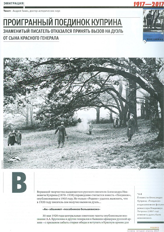Вершиной творчества Александра Ивановича Куприна считается повесть «Поединок», опубликованная в 1905 году. В 1920 году писатель сам получил вызов на дуэль от сына красного генерала и отказался от участия в поединке. В статье подробно описаны мотивы дуэли и причины отказа Куприна от нее, также упоминается о том, как сложились судьбы несостоявшихся дуэлянтов.