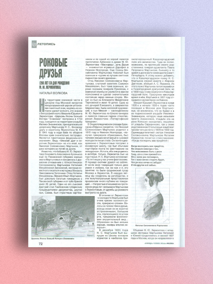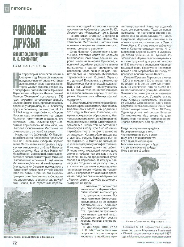 В данной статье рассматривается личность Николая Соломоновича Мартынова, близкого друга и однополчанина М. Ю. Лермонтова, от руки которого погиб поэт. Но автор не вешает на Мартынова ярлык «злодея», как многие другие исследователи, а пытается показать, что тот был человеком, не лишенным разносторонних способностей, в том числе и литературных, пусть и несовершенных, обладал не только недостатками, но и достоинствами, непростым характером, своими взглядами на жизнь. Приведены письма и воспоминания современников Мартынова и Лермонтова, свидетельствующие о непростых отношениях между ними на протяжении нескольких лет. Ведь мы многое уже знаем о Дантесе, почему бы не узнать и о Мартынове?