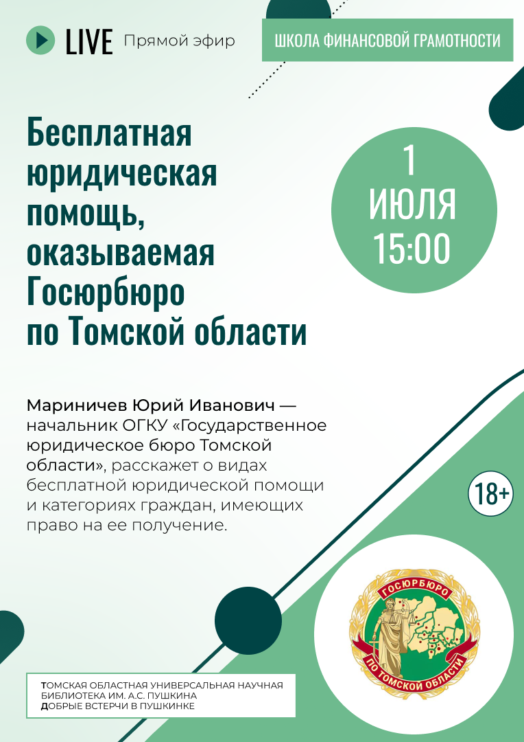 Прямой эфир «Бесплатная юридическая помощь, оказываемая Госюрбюро по Томской области» (18+)