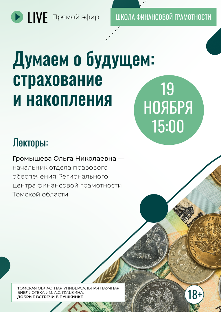 Хотите обеспечить финансовую безопасность себе и своим близким? Тогда присоединяйтесь к нашей лекции! Громышева Ольга Николаевна, начальник отдела правового обеспечения Регионального центра финансовой грамотности Томской области расскажет, как правильно формировать накопления, выбирать подходящие виды страховки и подготовиться к любым жизненным ситуациям.
