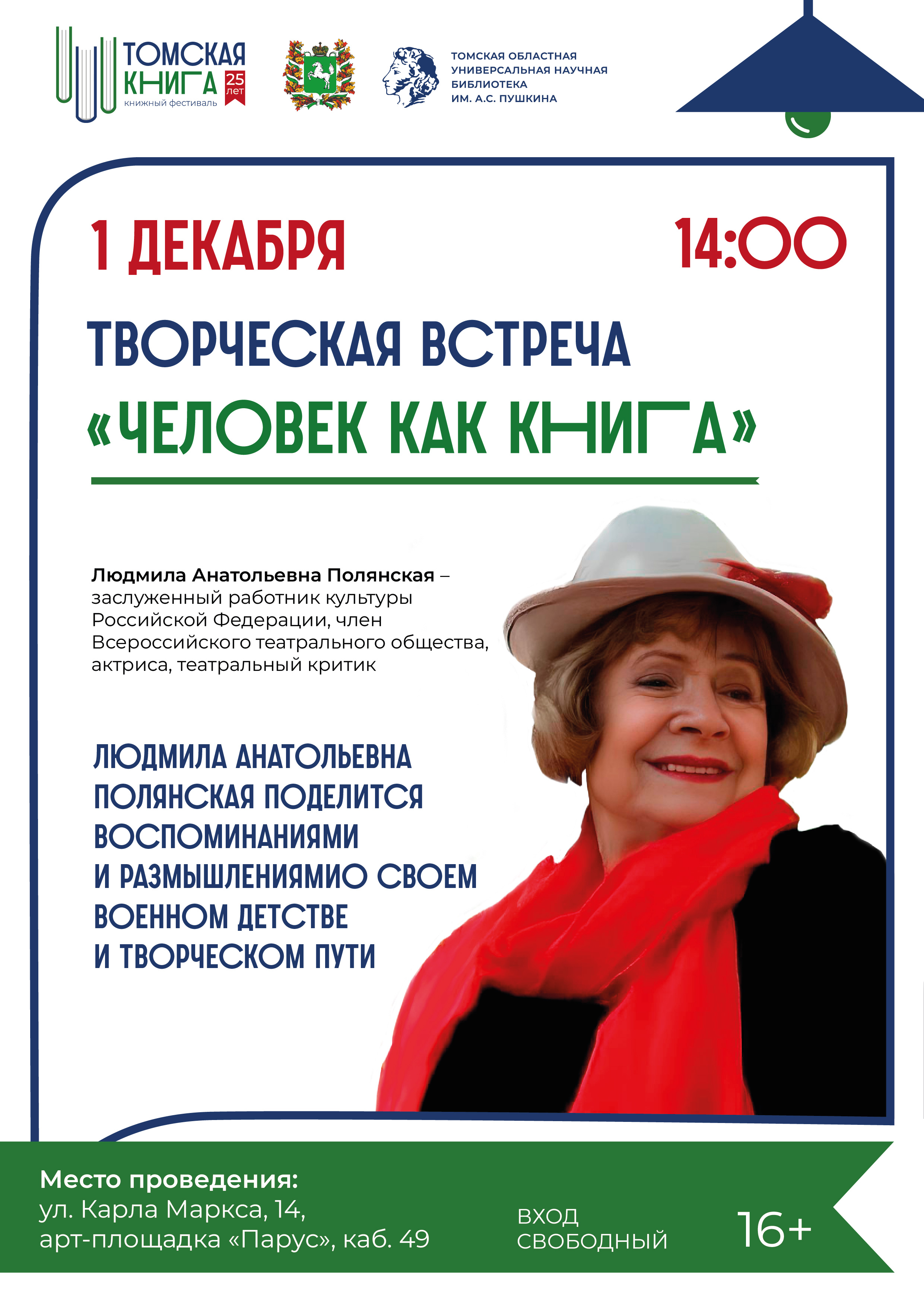 Приглашаем на творческую встречу с Людмилой Анатольевной Полянской, заслуженным работником культуры Российской Федерации, членом Всероссийского театрального общества, актрисой, театральным критиком.
