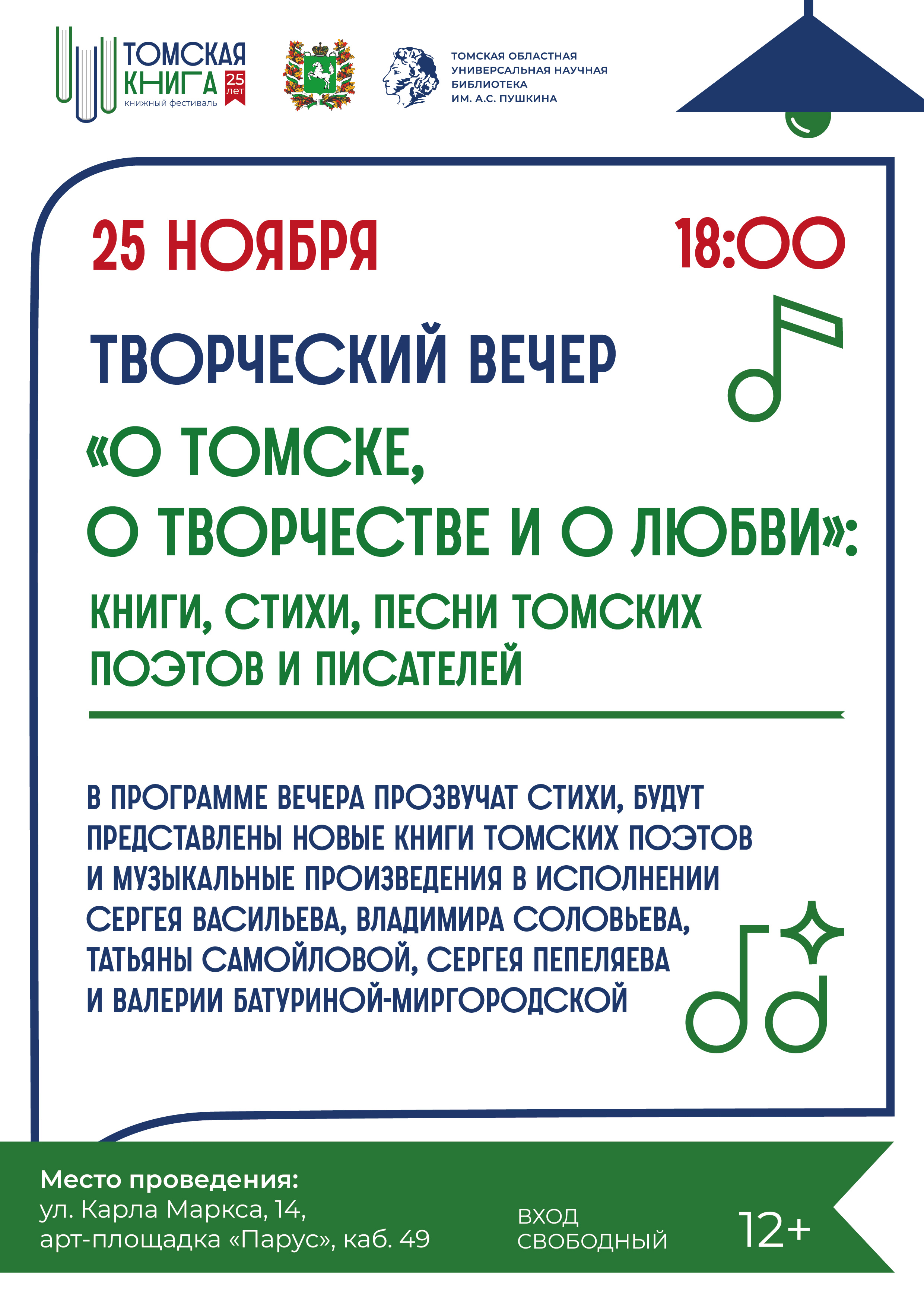 Прозвучат стихи, будут представлены новые книги томских поэтов и музыкальные произведения в исполнении Сергея Васильева, Владимира Соловьева, Татьяны Самойловой, Сергея Пепеляева и Валерии Батуриной-Миргородской.