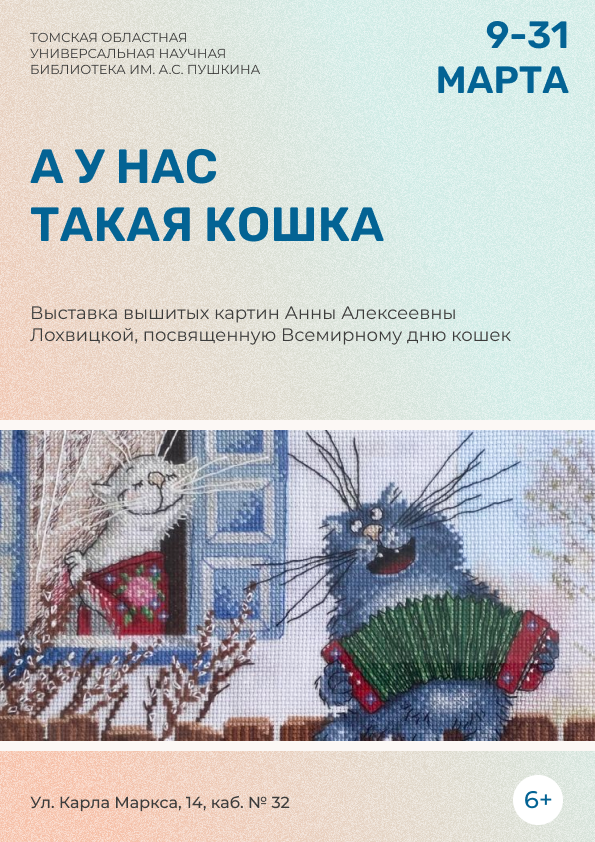 На выставке представлены удивительные работы Анны Алексеевны Лохвицкой, руководителя клуба «Четверги у Алексеевны». А удивительные потому, что это картины вышитые, и еще потому, что они все посвящены кошкам. Более 57 работ познакомят вас с жизнью необычных или обычных котов. Здесь множество оригинальных сюжетов, в том числе история Василия и Мурки и других персонажей нашей выставки.
