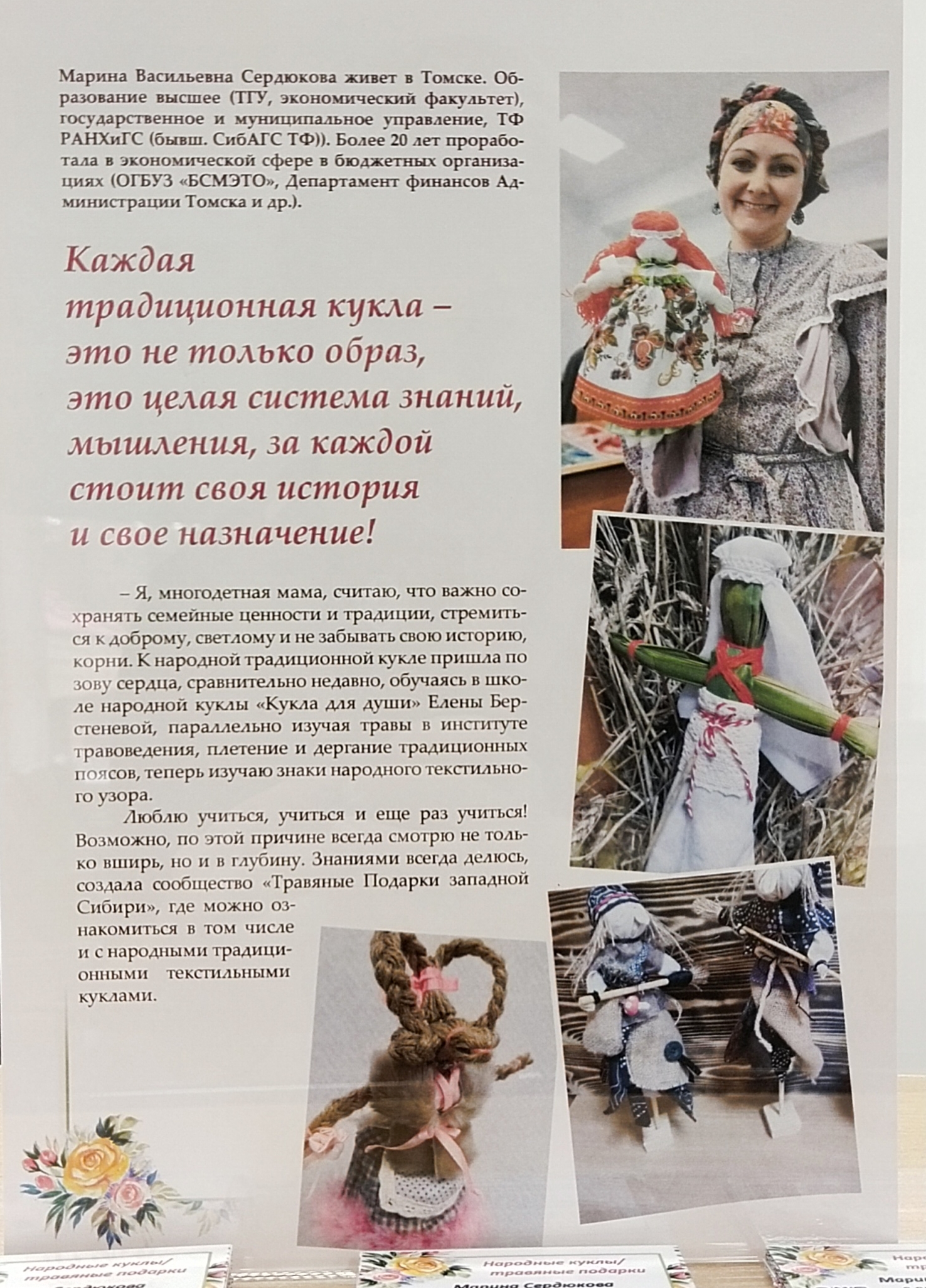 В общем читальном зале ТОУНБ им. А. С. Пушкина развернута выставка кукол Марины Васильевны Сердюковой. Мастерица изготавливает их сама, используя традиционные технологии. Многодетная мать, более 20 лет проработала в экономической сфере. К народной традиционной кукле пришла сравнительно недавно, по зову сердца.
