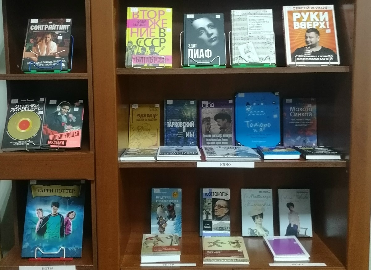 Книги на выставке расположены по разделам: музыка, кино, театр, балет, ноты, дизайн, изобразительное искусство и декоративно-прикладное искусство.