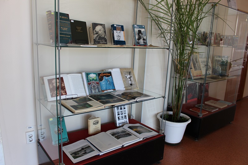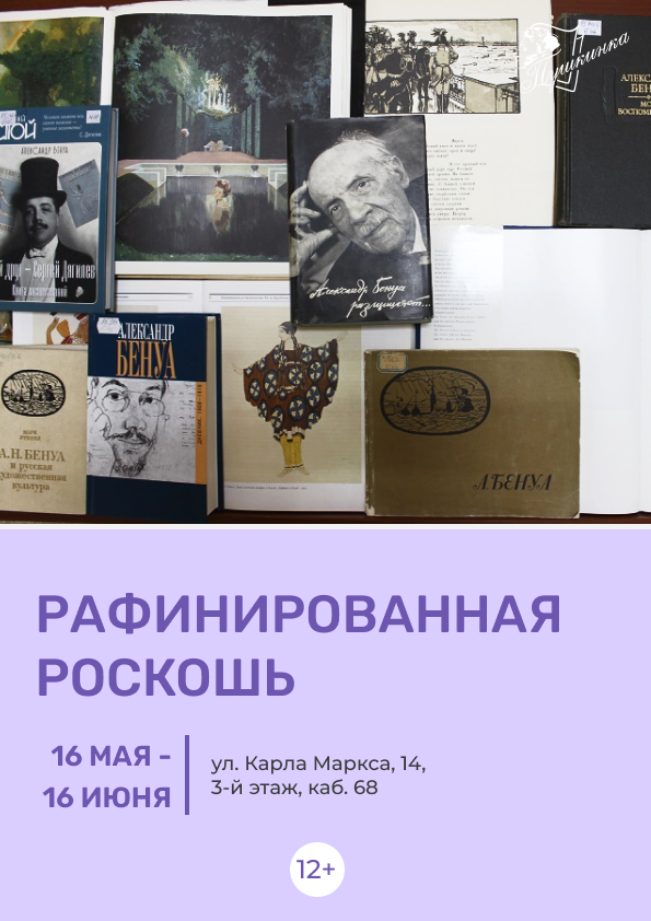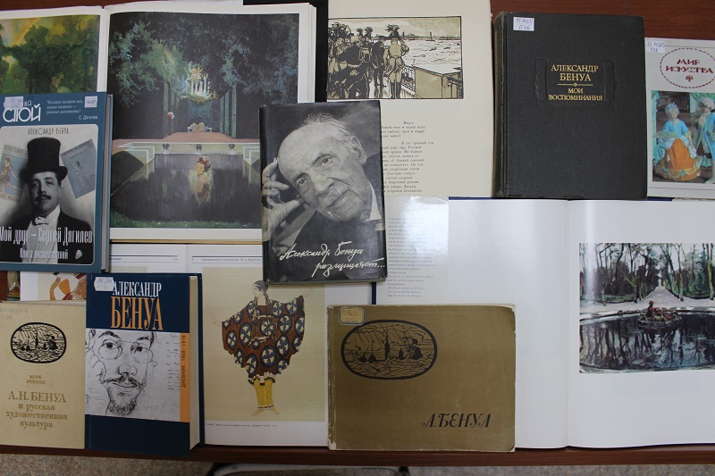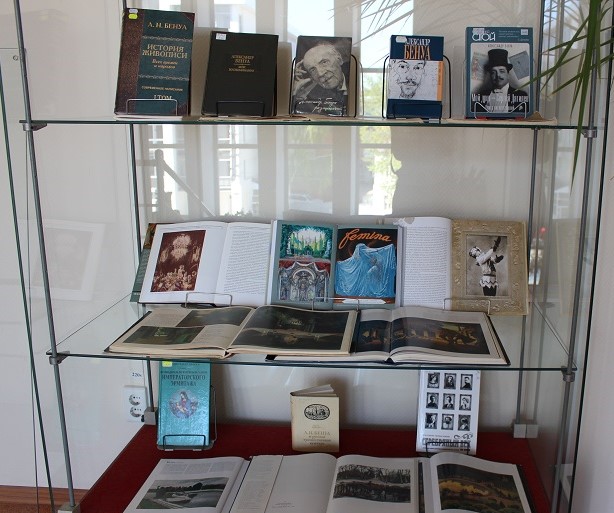 На выставке представлены репродукции картин А. Н. Бенуа, книги с его исследованиями и воспоминаниями, монографии, посвященные этому уникальному человеку.