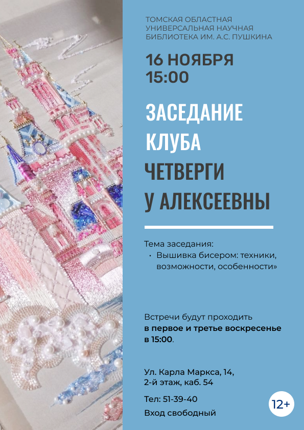 Тема встречи — «Вышивка бисером: техники, возможности, особенности». На очередном заседании участницы клуба «Четверги у Алексеевны» узнают об особенностях вышивки бисером.