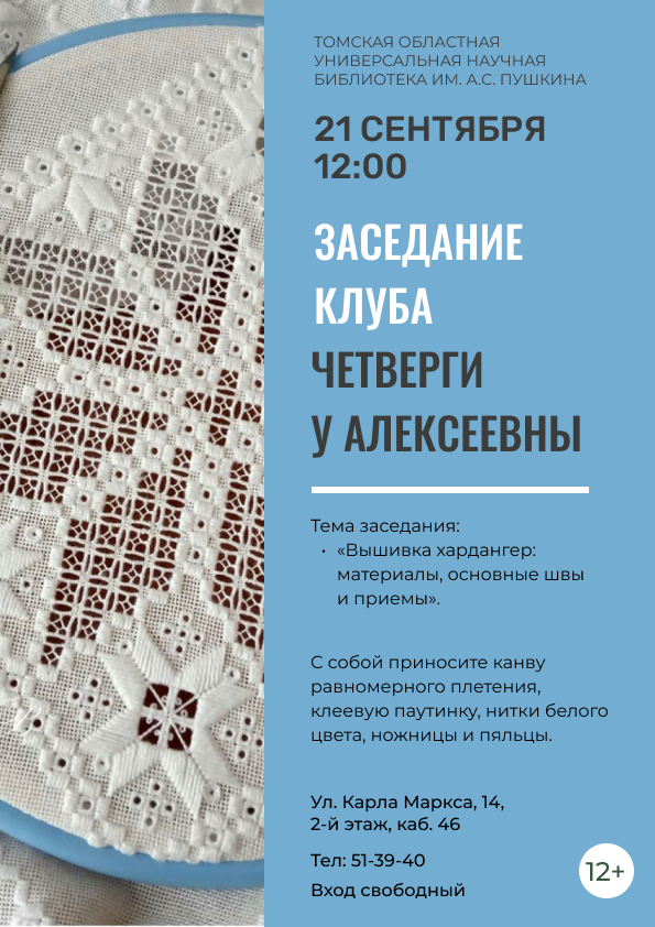 Тема очередного занятия в клубе «Четверги у Алексеевны» — «Вышивка хардангер: материалы, основные швы и приемы».