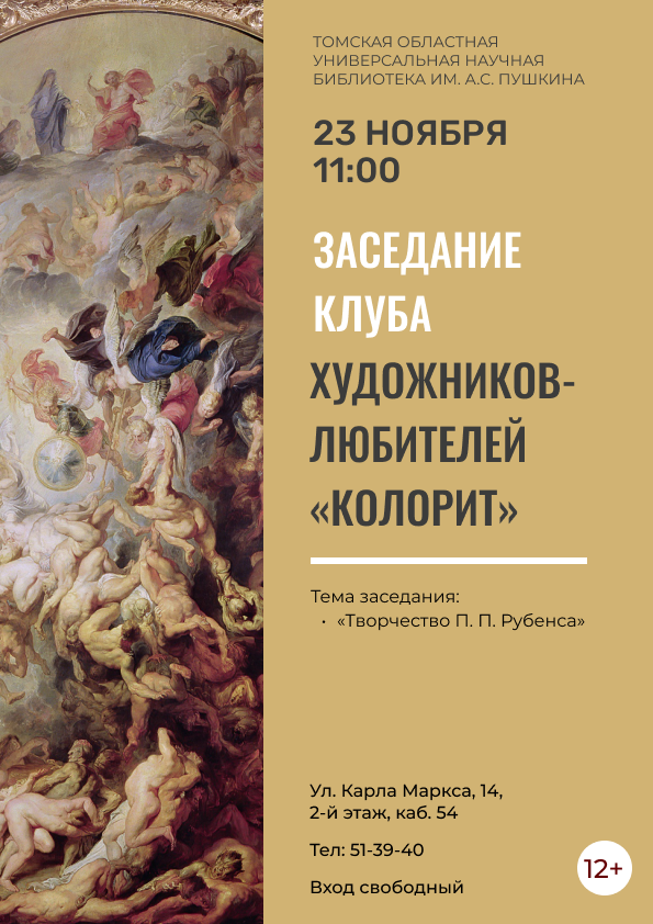 Н. Э. Либина, участница клуба художников-любителей «Колорит», познакомит участников встречи с творчеством Питера Пауля Рубенса (157 —1640) — нидерландского (фламандского) живописца.