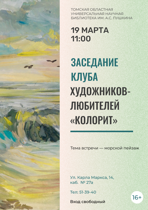 Куратор встречи — Александр Петрович Соколов, руководитель клуба. Сотрудники отдела абонемента подготовят выставку книг по изобразительному искусству.