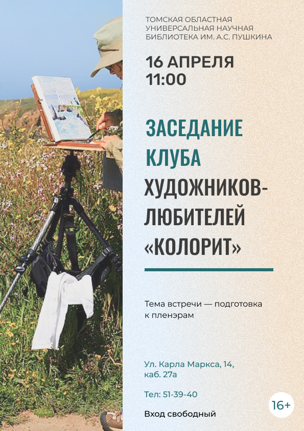 Куратор встречи — Александр Петрович Соколов, руководитель клуба. Сотрудники отдела абонемента подготовят выставку книг по изобразительному искусству.