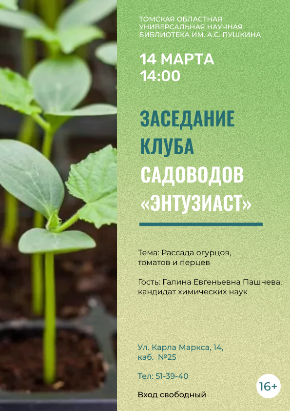 На очередном заседании клуба «Энтузиаст» Галина Евгеньевна Пашнева, кандидат химических наук, прочтет лекцию «Рассада огурцов, томатов и перцев». Она поделится своими рассадными хитростями, поскольку сама садовод и огородник. Более 50 лет занимается селекцией и испытанием различных сортов картофеля. Галина Евгеньевна принесет образцы удобрений для выращивания крепкой и здоровой рассады.