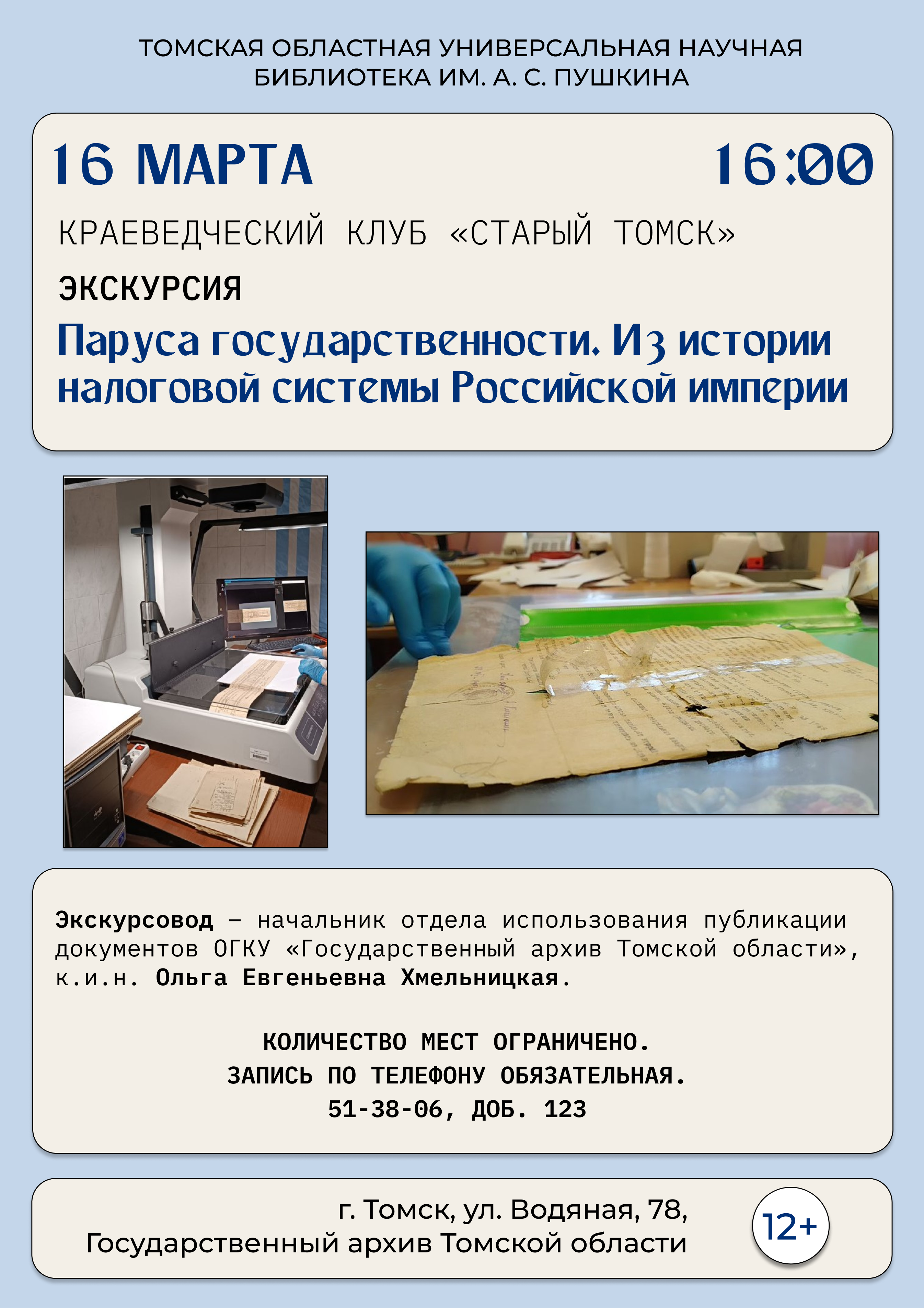 Тема встречи — «Паруса государственности. Из истории налоговой системы Российской империи». Участники краеведческого клуба «Старый Томск» посетят Государственный архив Томской области, где ознакомятся с архивными документами по истории налогообложения в Томске и Томской губернии в XVIII — начале XX века. Выставка также будет интересна людям, занимающимся генеалогией, так как документы о сборе податей и налогов — вторая основная группа генеалогических источников после метрических книг и исповедных росписей.