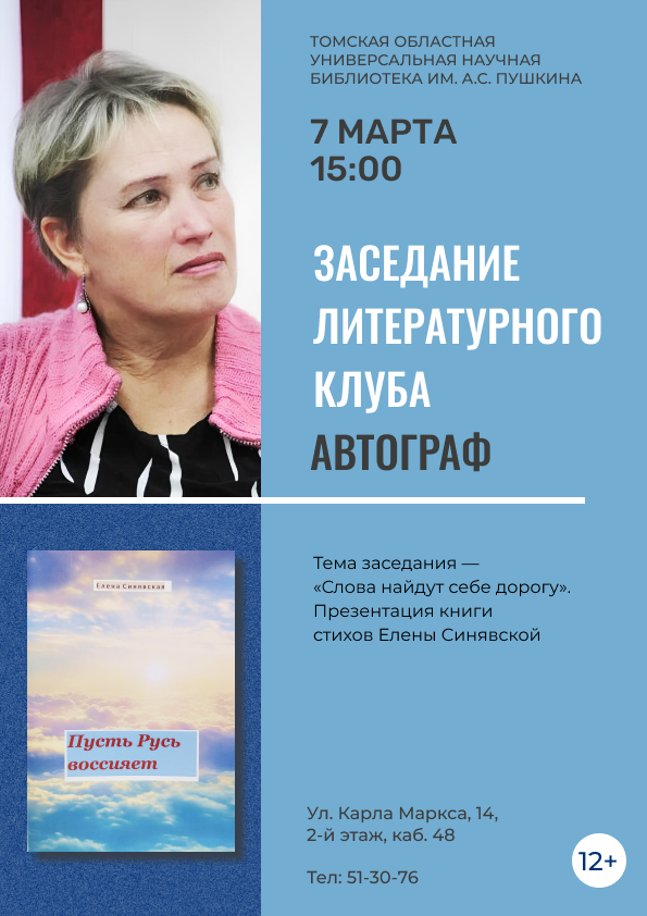 На очередном заседании литературного клуба «Автограф» состоится презентация новой книги стихов Елены Синявской «Пусть Русь воссияет» (Томск, 2026).